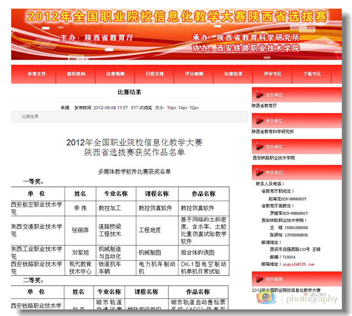 8月8日,2012年全国职业院校信息化教学大赛陕西省选拔赛成绩揭晓。我院7位教师喜获佳绩:刘军旭获“多媒体教学软件比赛”一等奖,王艳芳、耿凡娜获“信息化教学设计比赛”一等奖,赵宏强获“网络课程比赛”一等奖;赵革委、刘霞获得“多媒体教学软件比赛”二等奖,李龙龙获“网络课程比赛”二等奖。其中,一等奖获得者刘军旭、王艳芳、耿凡娜、赵宏强还将代表陕西参加全国比赛。