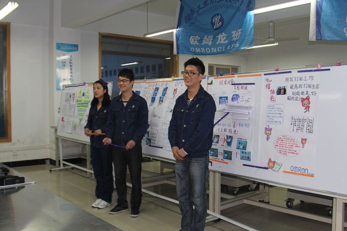 8点30分,随着全体学员齐声朗读我院校训及欧姆龙社训,总结大会正式开始。本次活动采用小组成员协作演讲、教师辅助、学生自评、提问讨论的形式进行。8个汇报小组在20分钟的汇报时间内,首先用图文并茂的板报介绍最近一周的学习情况,他们分别从5S活动、安全知识、TPM 0阶段和1阶段中的安全隐患等方面总结了学习成果及学习过程中的不足,提出了今后的学习目标、改进方向及本次活动的感言。随后,参会领导、老师及同学们互动交流和激烈探讨。最后,由学生自评小组给出得分,并对表现优异的队员发奖。