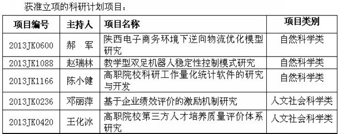 根据《陕西省教育厅关于下达2013年科学研究项目计划(一)目录的通知》(陕教技【2013】9号),经专家评审,我院共有5项专项科研计划项目获准立项,其中自然科学类项目3项,人文社科类项目2项。