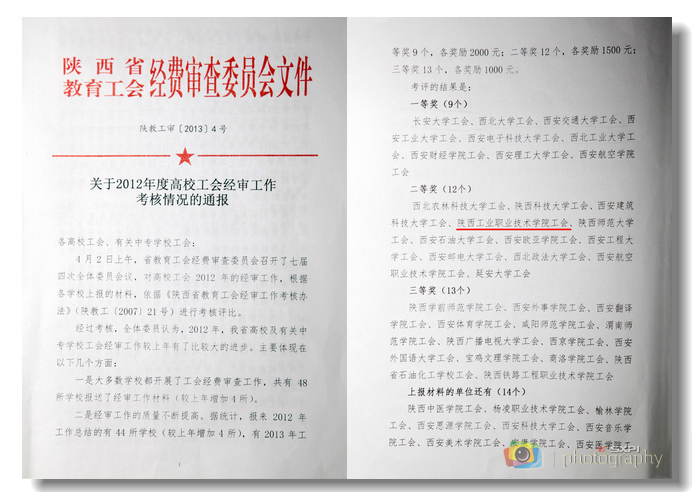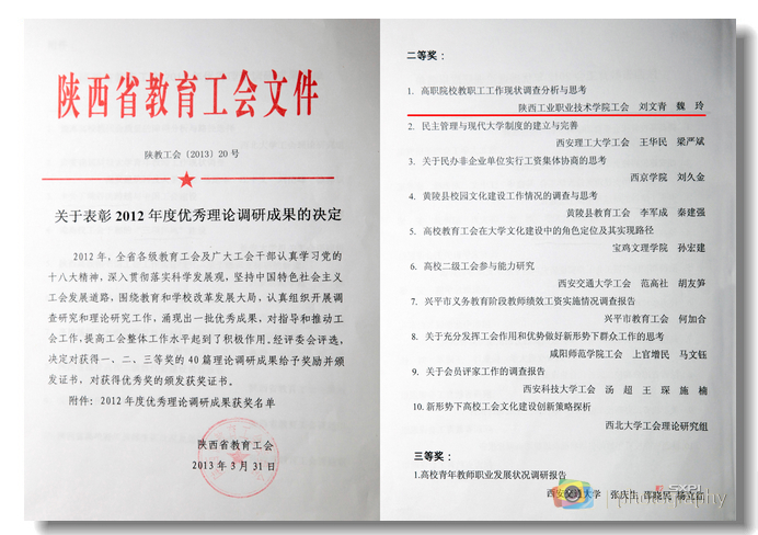 日前,从陕西省教育工会2012年度工运理论研究会上传来喜讯,由我院工会主席刘文青和图书馆教师魏玲联合调研、撰写的工运研究成果《高职院校教职工工作现状调查分析与思考》一文荣获陕西省教育工会2012年度优秀理论调...