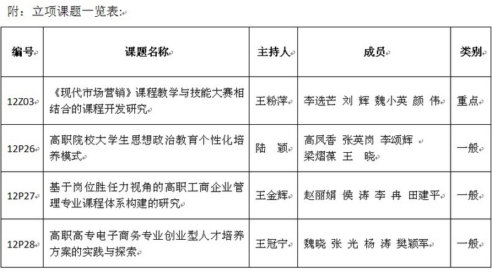 根据陕西省高职高专学会(省一级学会)“关于确定学会2012年度高等职业教育教学研究改革项目的通知”(陕高职学字〔2012〕3号),我院共有4项教育教学改革研究课题获准立项,其中王粉萍老师主持的“《现代市场营销》...